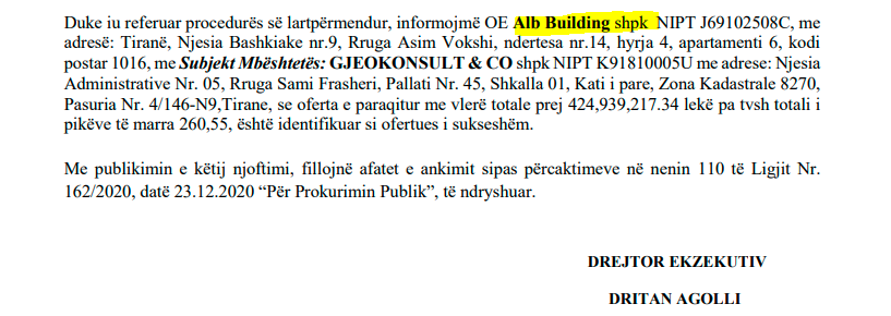 Megjithatë, Dritan Agolli sic duket e ka paracaktuar fituesin “ALB-BUILDING” shpk me pronarë Pëllumb Beta dhe Odhise Bresha.