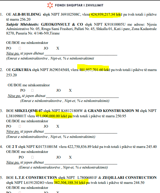 Po ashtu më të ulëta janë edhe 3 ofertat e fundit: operatori ekonomik “ED KONSTRUKSION” shpk, 410,982,709.28 lekë pa tvsh; VELLEZERIT HYSA shpk,398,240,805.15 lekë pa tvsh; BOE “ALBA KONSTRUKSION” shpk & “O.B.KONSTRUKSION” shpk & “ZENIT& CO” shpk me vlerë 418,603,667.76 lekë pa tvsh.