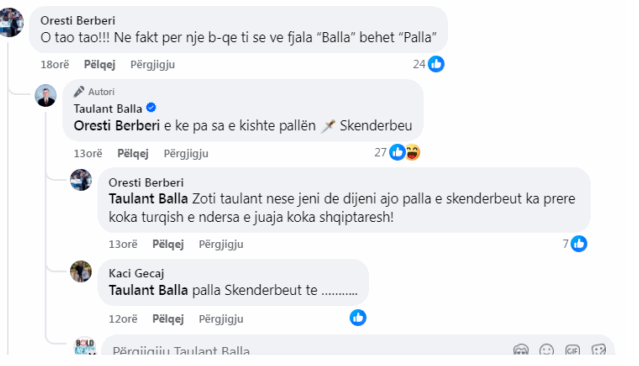 “O tao tao!!! Ne fakt per nje b-qe ti se ve fjala “Balla” behet “Palla”, shkruan qytetari, ndërkohë që Taulant Balla i përgjigjet: “Oresti Berberi e ke pa sa e kishte pallën (figurë me simbol shpate) Skenderbeu”