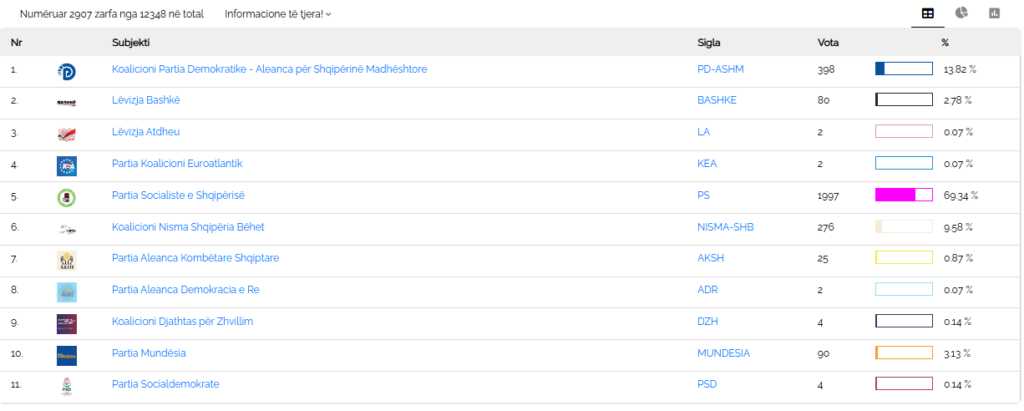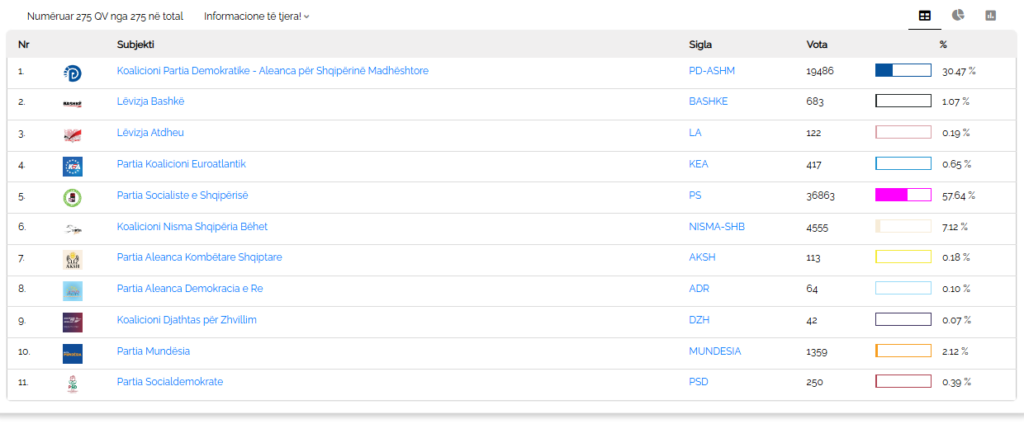 Partia Socialiste e Shqipërisë (PS) ka siguruar 36.863 vota, që përbën 57.64 të totalit.