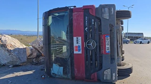 Një kamion i ngarkuar me gurë është përmbysur në rrugë në zonën e Porto Romanos, në Durrës.