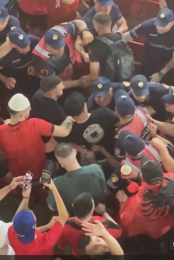 E më vonë ishte një moment edhe më i rëndë, ku mbi 20 policë e rrethuan një tifozë që po mbante veshur një fanellë me stemën e UÇK-së. Përkundër se tifozët tjerë u munduan ta mbronin tifozin, ai u kap nga forcat e Policisë së Shtetit dhe u u largua nga stadiumi.