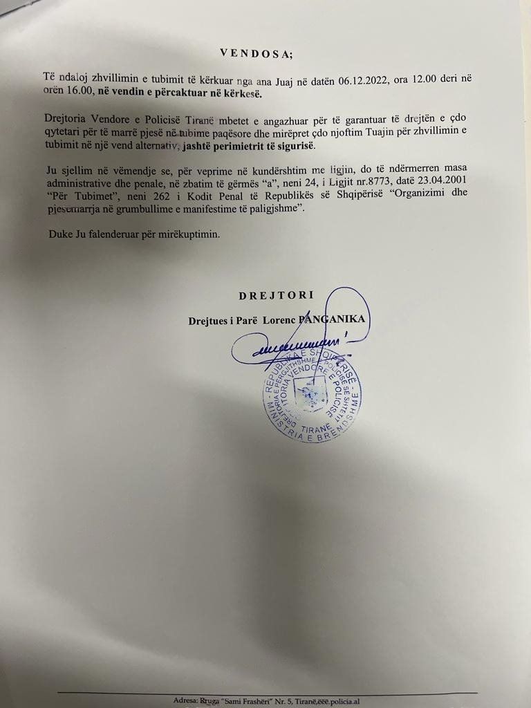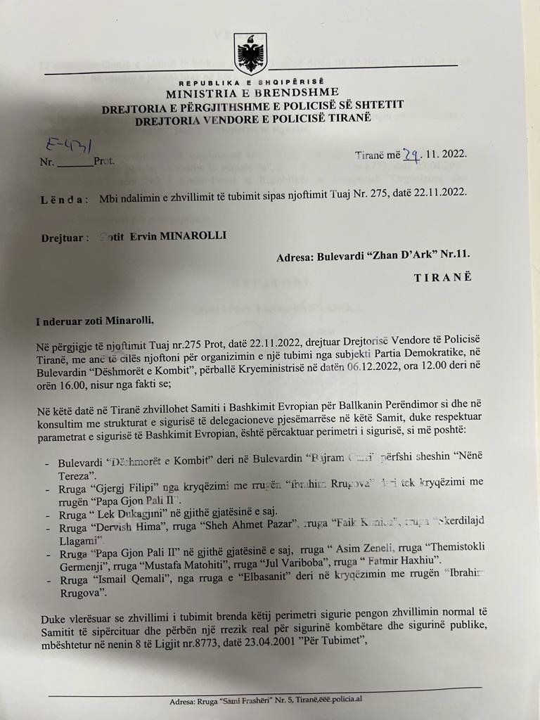 Në shkresën drejtuar përfaqësuesit të PD, policia sugjeron zhvillimin e protestës në një vend ku nuk është përcaktuar perimetër sigurie për samitin.