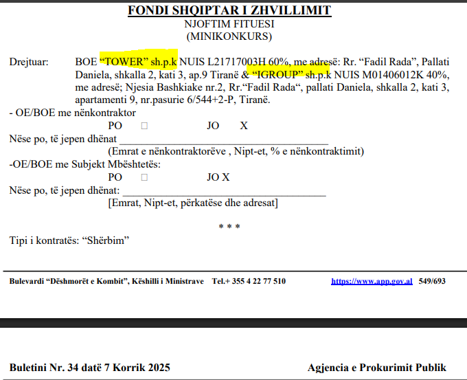 Fituesi i minikonkursit është një studio e afërt me aferat e e Erion Veliajt. Pronari i saj Irdi Kulla ka marrë pjesë me dy kompanitë e tij: “TOWER” sh.p.k. dhe  “IGROUP” sh.p.k. duke marrë vlerësimin maksimal të Agollit.