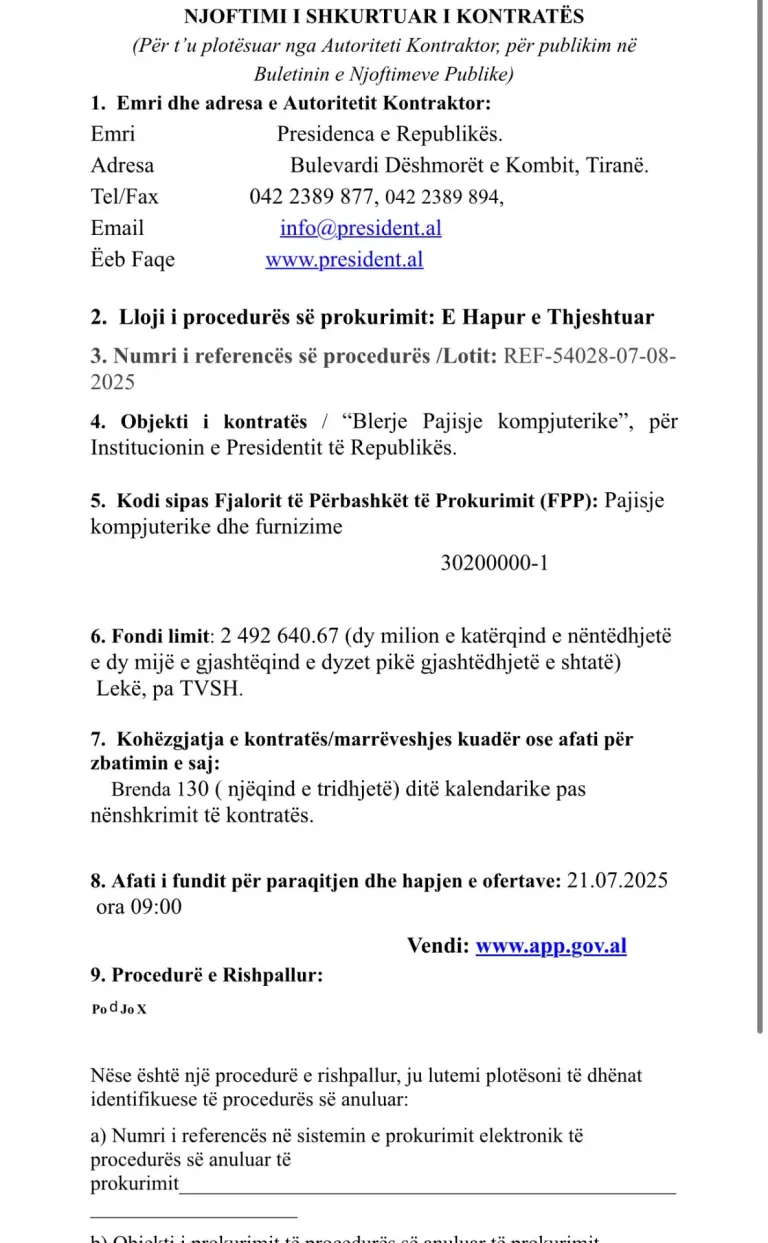 Sipas dokumenteve zyrtare të prokurimit (REF-54028-07-08-2025), objekti i kontratës është “Blerje Pajisje kompjuterike” për Institucionin e Presidentit të Republikës. Procedura është klasifikuar si “e hapur e thjeshtuar” dhe do të zgjasë 130 ditë kalendarike, çka ngre pikëpyetje të tjera mbi urgjencën dhe nevojën reale për pajisjet.