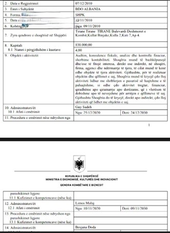 Të afërmit e ministrit kanë në pronësi dy kompani auditimi, “BDO ALBANIA” shpk dhe “PBM” shpk, ku te kompania e parë janë aksionerë së bashku me një shtetas dhe kompani të huaj.
