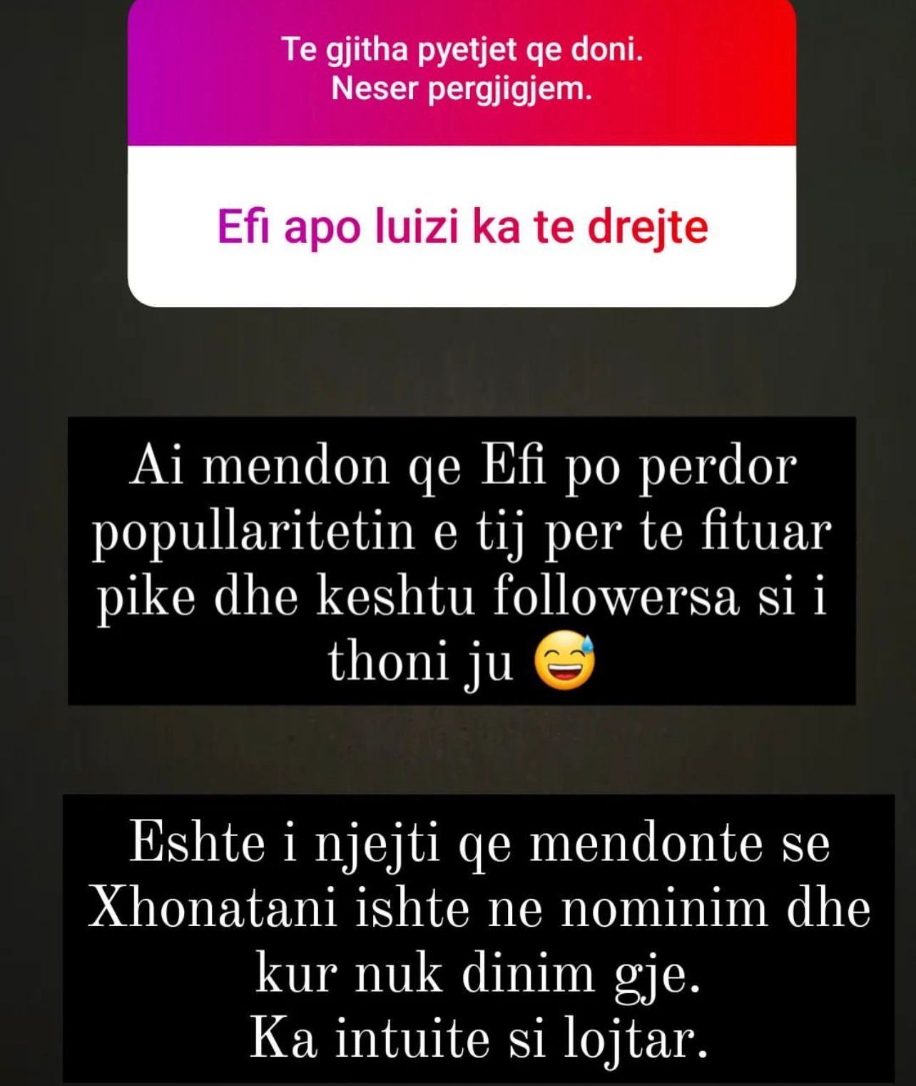 Më tej, artisti i njohur ka komentuar edhe debatin e Luizit me Efin. Sipas Maestros Luizi ka të drejtë kur thotë se Efi po e përdor për të rritur ndjekësit në rrjetet sociale.