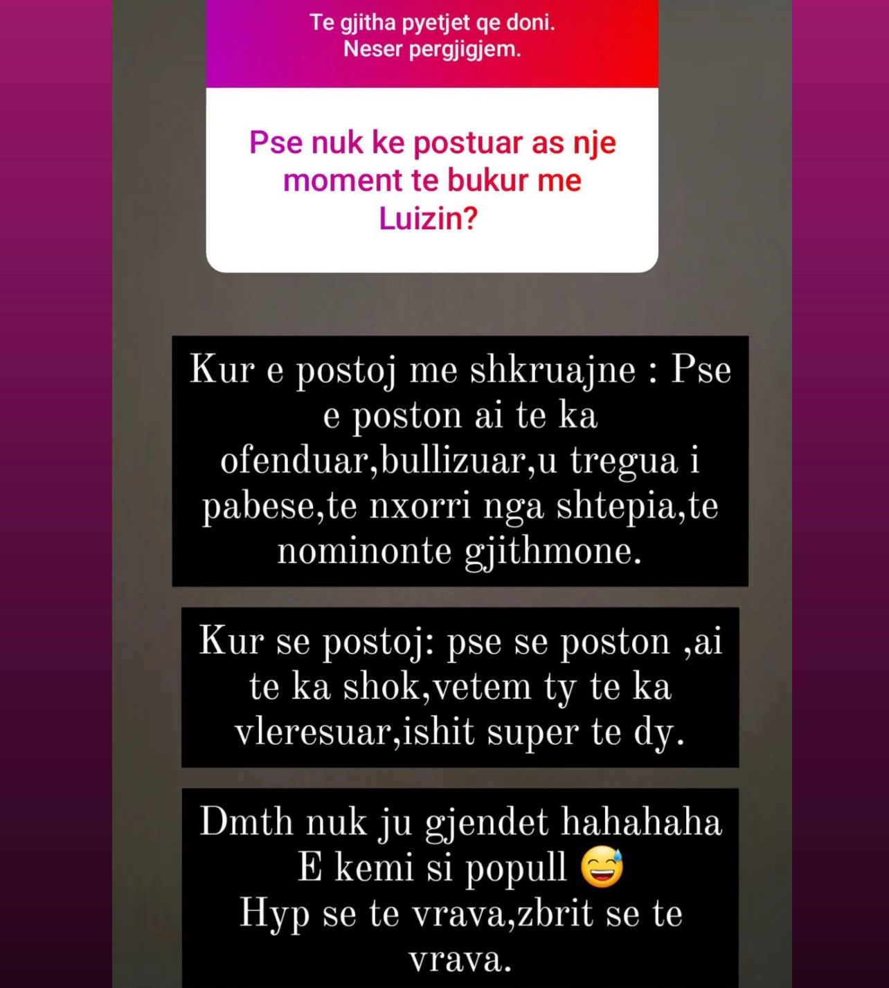 Ndërkohë ai u ka dhënë përgjigje edhe pyetjeve se pse nuk poston video me Luizin duke thënë se kur e ka bërë këtë gjë ka marrë kritika nga ndjekësit të cilët i kanë kujtuar debatet që ata kanë pasur me njëri tjetrin.