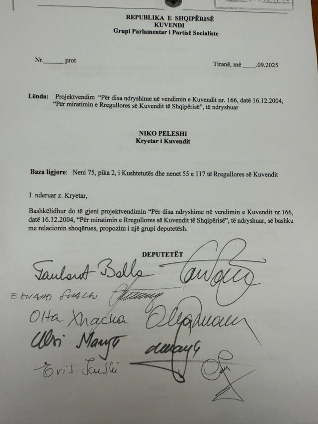 Dokumenti i është depozituar kryetarit të Kuvendit,Niko Peleshit me firmën e Taulant Ballës, Olta Xhaçkës, Eduard Shalsit, Ulsi Manjës dhe Evis Kushit.