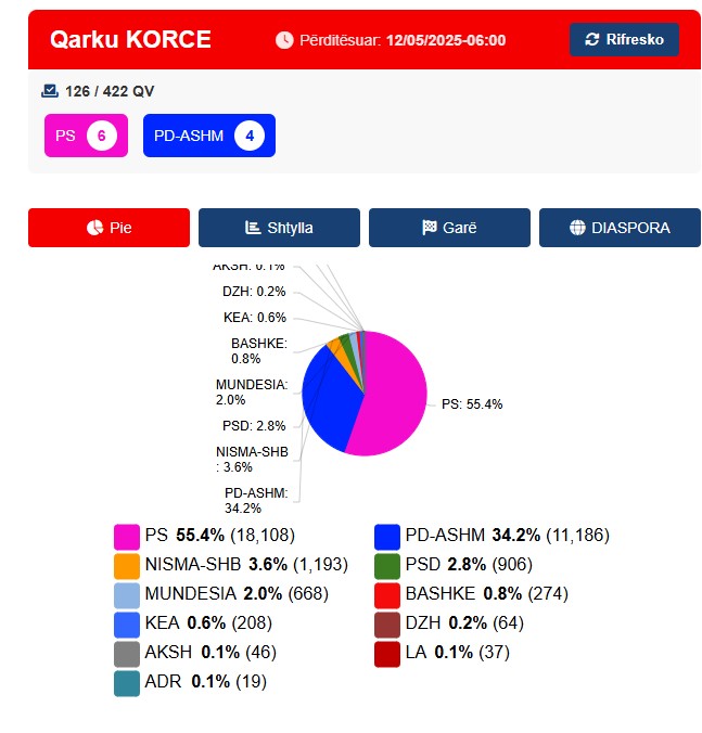 Komisioni Qendror i Zgjedhjeve ka publikuar rezultatet për zgjedhjet e 11 majit në qarkun e Korçës, ku deri më tani janë numëruar 163 nga 422 kuti votimi. Forcë e tretë renditet Koalicioni Nisma Shqipëria Bëhet, e cila ka grumbulluar 1,545 vota, që përfaqësojnë 3.8% të totalit të votave. Ndërsa Partia Socialdemokrate (PSD) e Tom Doshit ka marrë  1,091 vota, 2.6% dhe remditet e katërta.