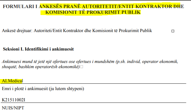 Ankesa e firmosur nga administratorja Laida Suloti ka mbërritur në KPP më 2 korrik 2025. Konkretisht kompania “ALMedical” shpk ka renditur disa kritere që janë në mënyrë flagrante në shkelje të Ligjit për Prokurimet Publike.