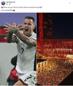 Pas një performance të shkëlqyer të Kombëtares shqiptare, kryeministri Edi Rama ka reaguar përmes një mesazhi urimi, duke përshëndetur fitoren emocionuese të kuqezinjve. “Fitore me gol, fitore me lojë, fitore me zemër kuqezi🦅”, shkroi Rama në rrjetet sociale, duke e shoqëruar mesazhin me hashtagun #ForcaSHQIPËRI