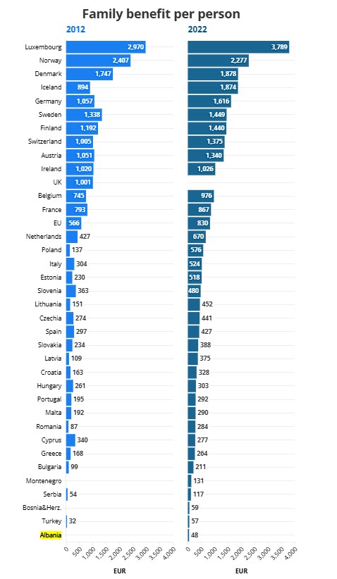 Më poshtë paraqitet grafiku i Eurostat, që tregon shpenzimet për përfitimet familjare për person në vitet 2012 dhe 2022. Ai ilustron diferencën e madhe midis vendeve të Europës Veriore dhe Perëndimore me ato të Jugut dhe Lindjes, me Shqipërinë në fund të renditjes.