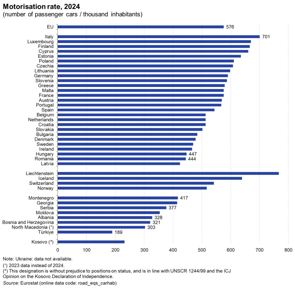 Mesatarja e Bashkimit Europian për vitin 2024 qëndron në rreth 576 makina për 1,000 banorë, gati dy herë më shumë se niveli shqiptar. Ky tregues tregon jo vetëm për mundësitë ekonomike, por edhe për mënyrën e jetesës, nivelin e urbanizimit dhe zhvillimin e infrastrukturës rrugore në vend.