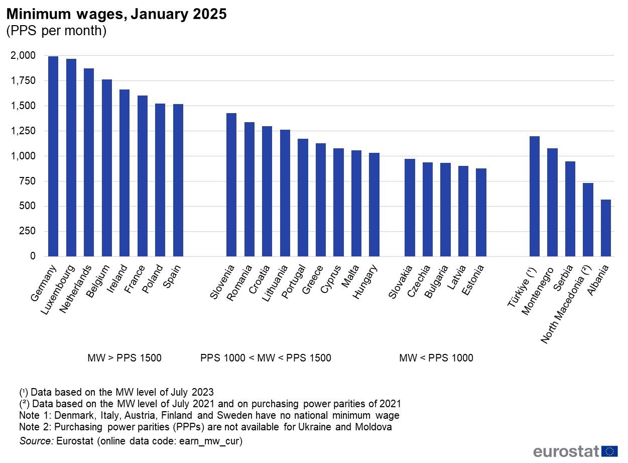 Bazuar në pagat e tyre minimale mujore bruto kombëtare të zbatueshme më 1 janar 2025, të shprehura në euro (€), vendet e BE-së në fjalë mund të klasifikohen në 3 grupe të ndryshme (shih Figurën 1, vendet jo anëtare të BE-së tregohen veçmas):