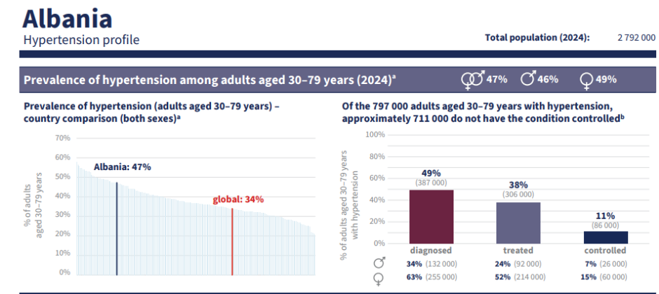 Të dhënat tregojnë se rreth 47% e shqiptarëve të moshës 30–79 vjeç vuajnë nga tensioni i lartë i gjakut, një shifër shumë më e lartë se mesatarja botërore prej 34%.