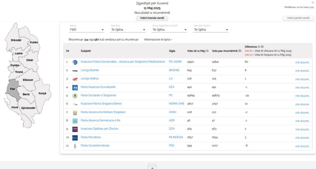 Në qarkun e Fierit janë rinumëruar mbi 50% e kutive të votimit, duke sjellë ndryshime në rezultatin përfundimtar të subjekteve politike.