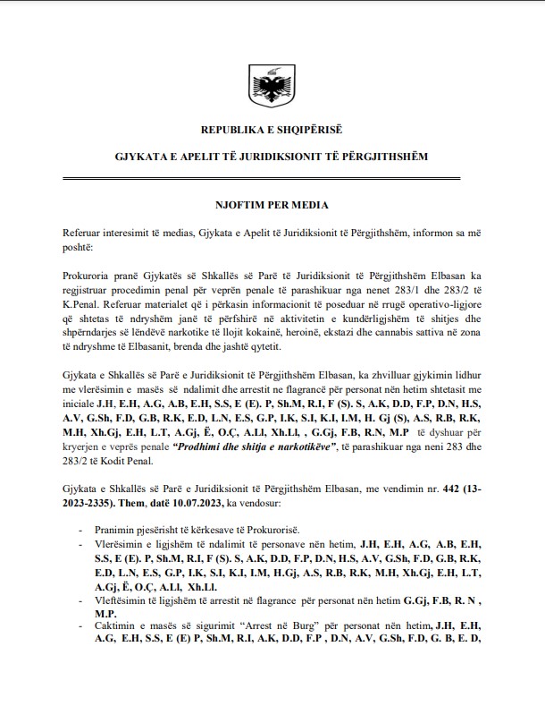 Gjykata e Apelit ka lënë në fuqi masat e sigurisë për 45 personat e arrestuar në kuadër të operacionit të koduar “Rrjeta”, ku sipas të dhënave zyrtare u goditën 4 grupe kriminale që shpërndanin drogë në qytete të ndryshme.