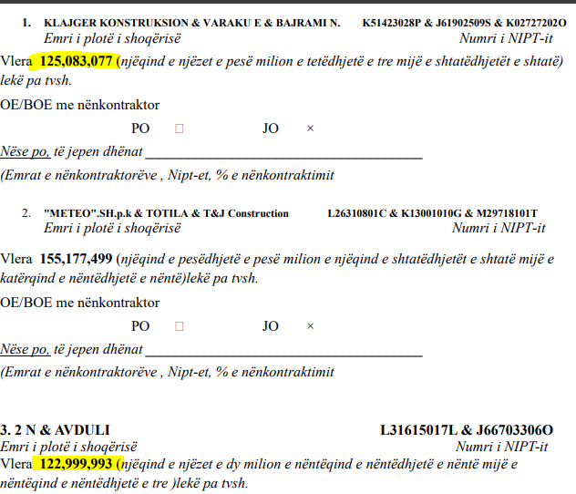 Kështu, bashkimi i operatorëve “2 N shpk & AVDULI shpk kishin ofertën me vlerë 122,999,993 lekë pa tvsh. Ndërsa bashkimi tjetër i operatorëve “LIS KONSTRUKSION” & LLAZO”, shpk propozoi ofertën 121,699,174.55 lekë pa tvsh.