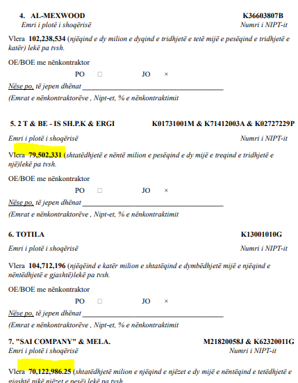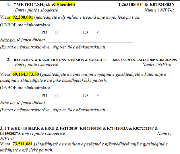 Kompanitë 2 T & BE – IS SH.P.K & ERGI & FATI 2010 bënë ofertën me vlerë 73,511,681 lekë pa tvsh. Po ashtu, “KUPA & SELAMI & STERKAJ” ofruan ta bëjnë këtë punë me 77,168,226.5 lekë pa tvsh.