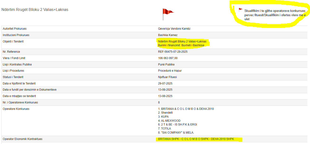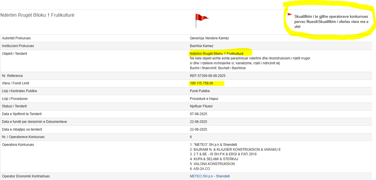 Në tenderin e mbajtur më 13 gusht 2025 kanë marrë pjesë 8 operatorë ekonomikë, por fituesi siç shihet nga dokumentet ka qenë i paracaktuar. Kontrata iu dha kompanisë “BRITANIA” të Shkëlqim Aliajt, që kishte ofertën me vlerë 71,977,721 lekë pa tvsh.