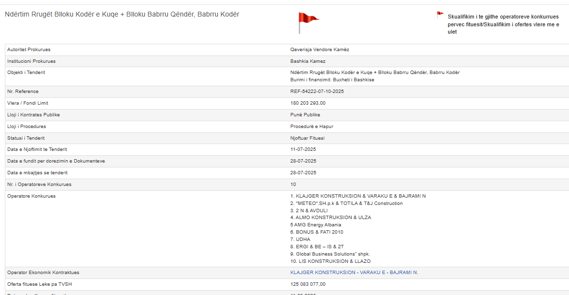 “Skualifikim i të gjithë operatorëve konkurrues përveç fituesit/ Skualifikim i ofertës me vlerë më të ulët”, kështu e ka klasifikuar tenderin Open Data Albania. Për shkeljet e konstatuara, procedura është shënuar me “Flamur të kuq” që është shenja e riskut të korrupsionit.