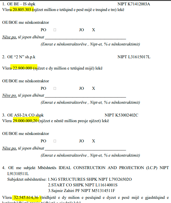 Në këtë nivel është edhe operatori “2 N” sh.p.k me vlerë 22.800.000 lekë. Ndërsa firma ASI-2A CO shpk ka dhënë oferën 29.000.000,20 lekë.