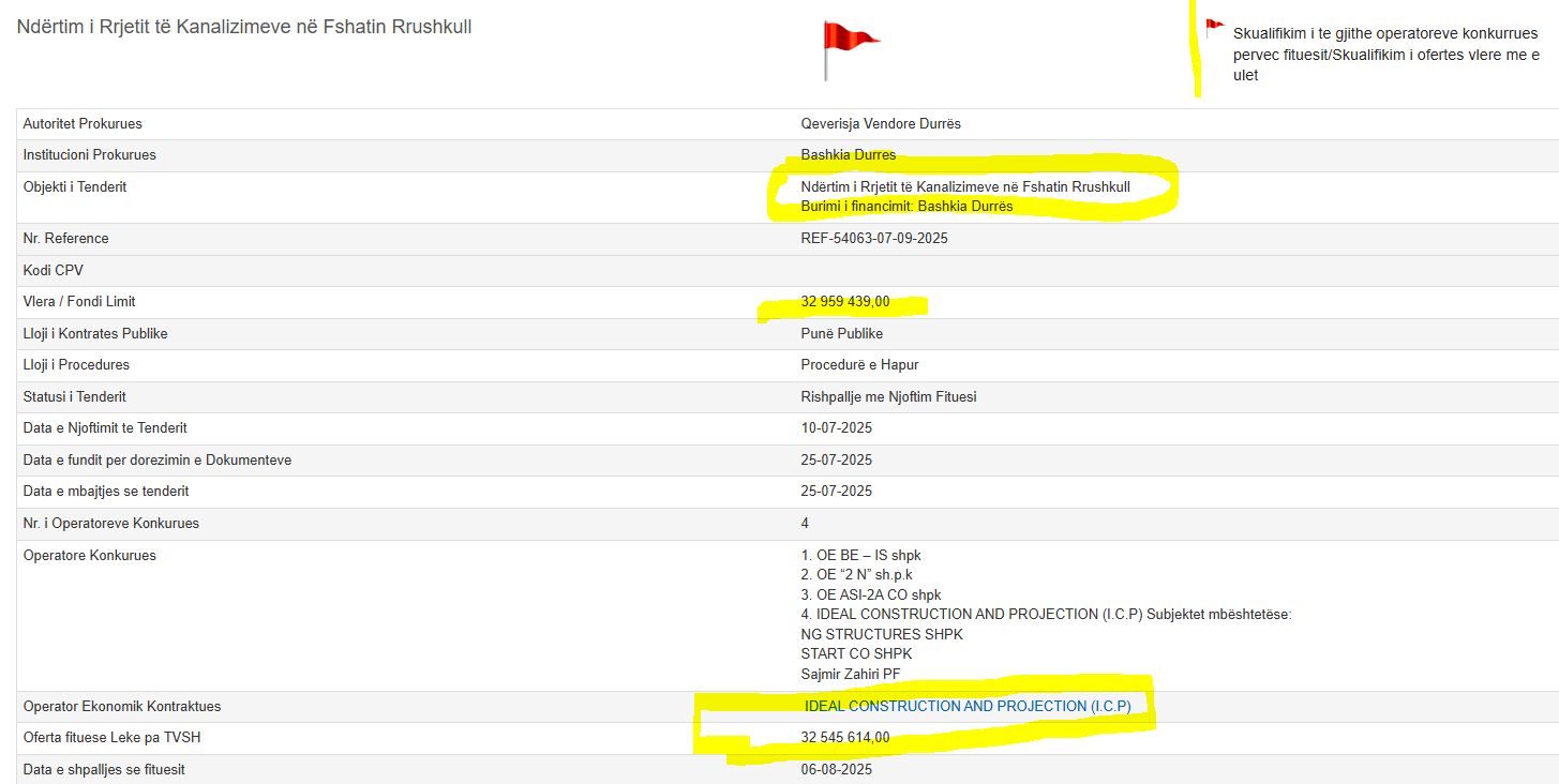 Konkretisht Operator Ekonomik Kontraktues      “IDEAL CONSTRUCTION AND PROJECTION (I.C.P)” shpk kishte ofertën me vlerë 32 545 614,00 lekë pa TVSH. Mjafton kjo ofertë që është gati sa fondi limit, që komisioni ta anulonte tenderin.