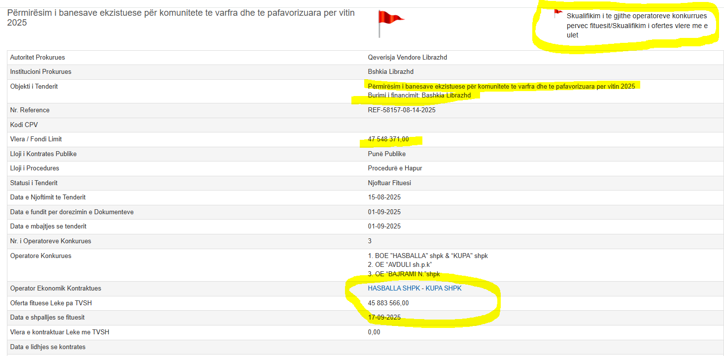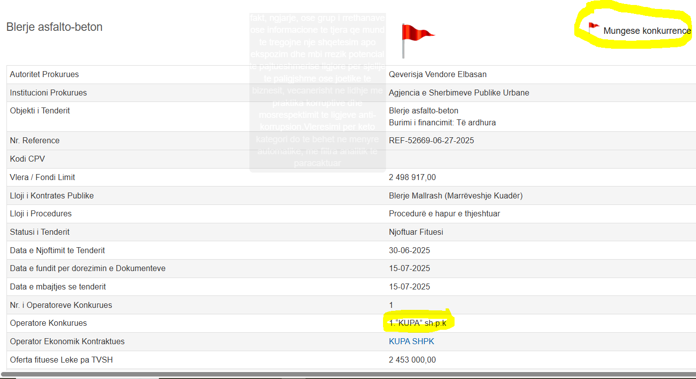 Sipas të dhënave të publikuara, kjo procedurë është shënuar me “Flamur të kuq”, për shkak të mungesës së konkurrencës dhe skualifikimeve të pajustifikuara.