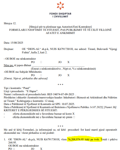 Ndërkaq, kompania “DION-AL”shpk është e angazhuar paralelisht edhe në një kontratë tjetër publike, që e ka lidhur me Bashkinë Tiranë.