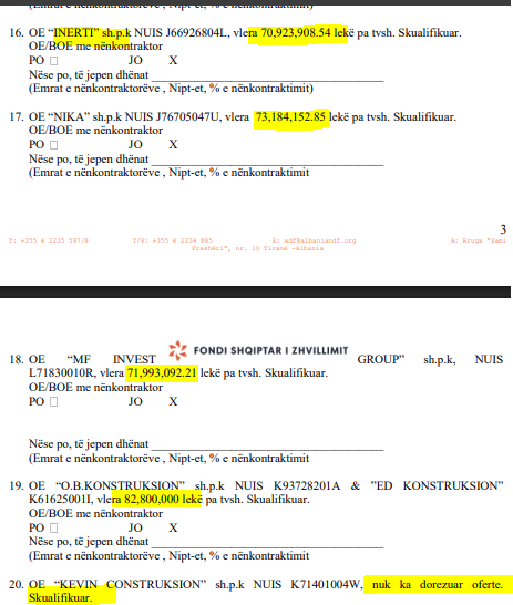 “DION-AL” fitoi me ofertën 76,208,976 lekë pa TVSH, ndërsa “INERTI” sh.p.k propozonte vlerën 70,923,908 lekë pa tvsh. Po ashtu “NIKA” sh.p.k kishte ofertë me vlerë 73,184,152.85 lekë pa tvsh. Propozim ekonomik është bërë edhe nga kompania “MF INVEST GROUP” sh.p.k, me vlerë 71,993,092 lekë pa tvsh.