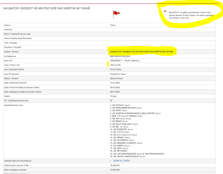 “Skualifikim i të gjithë operatorëve konkurrues përveç fituesit. Kusht: fituesi nuk është operatori me ofertën më të ulët”, kështu e ka klasifikuar Open Data Albania tenderin e mësipërm. Madje procedura është shënuar me “Flamur të kuq” që është shenja e riskut të korrupsionit.