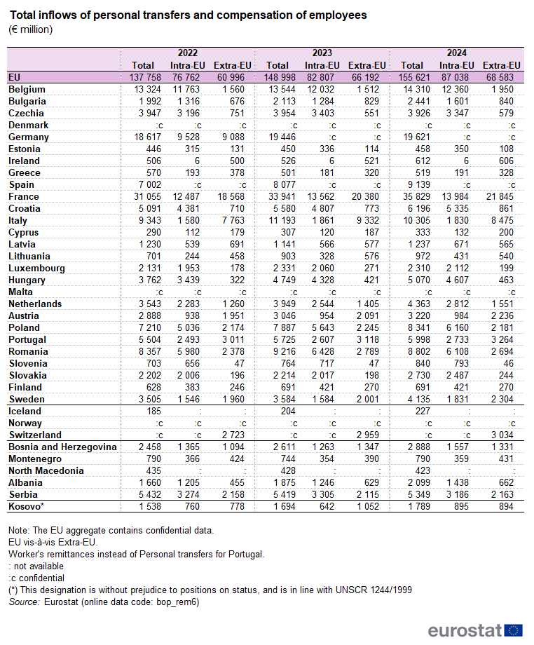Sipas njoftimit më të fundit të Eurostat, vendet e Bashkimit Europian kanë regjistruar edhe në vitin 2024 flukse të larta të transfertave personale dhe kompensimit të punonjësve, duke reflektuar lëvizjet e fuqisë punëtore brenda dhe jashtë BE-së. Në nivel të BE-së, totali i këtyre hyrjeve arriti rreth 155.6 miliardë euro, nga të cilat 87 miliardë euro erdhën nga vende brenda Unionit dhe 68.6 miliardë euro nga vende jashtë BE-së.