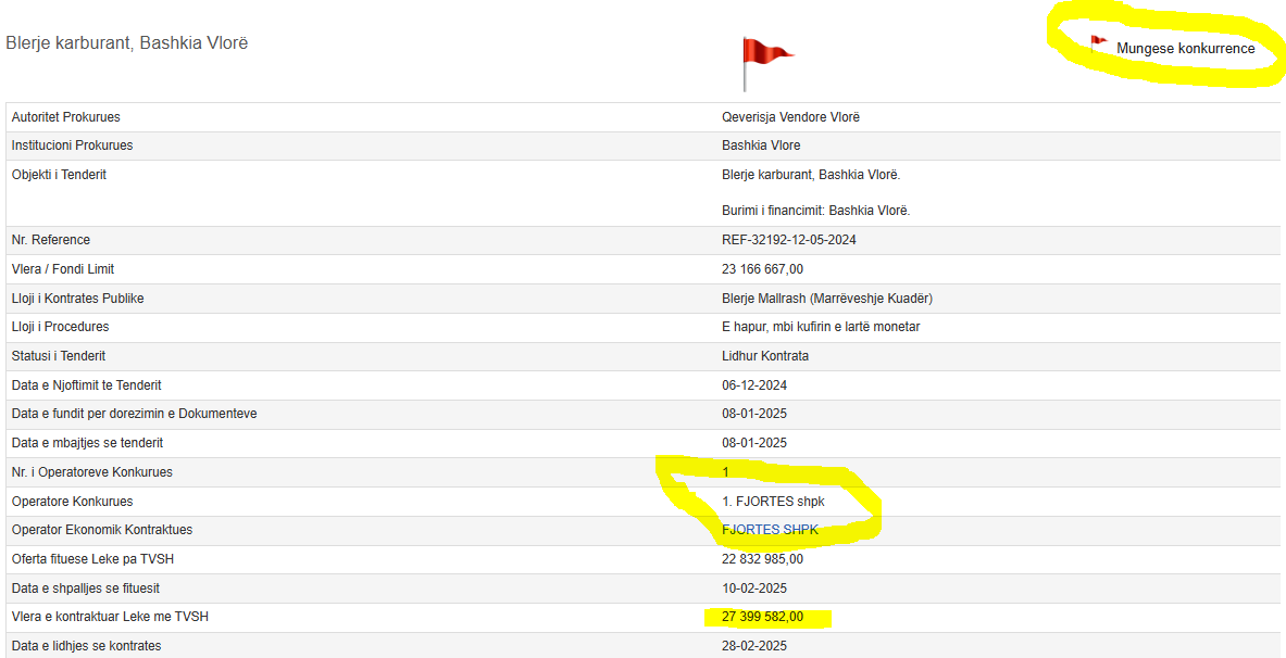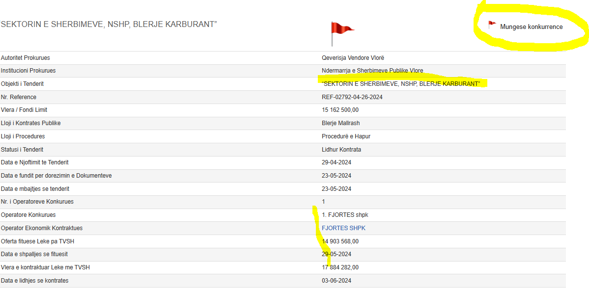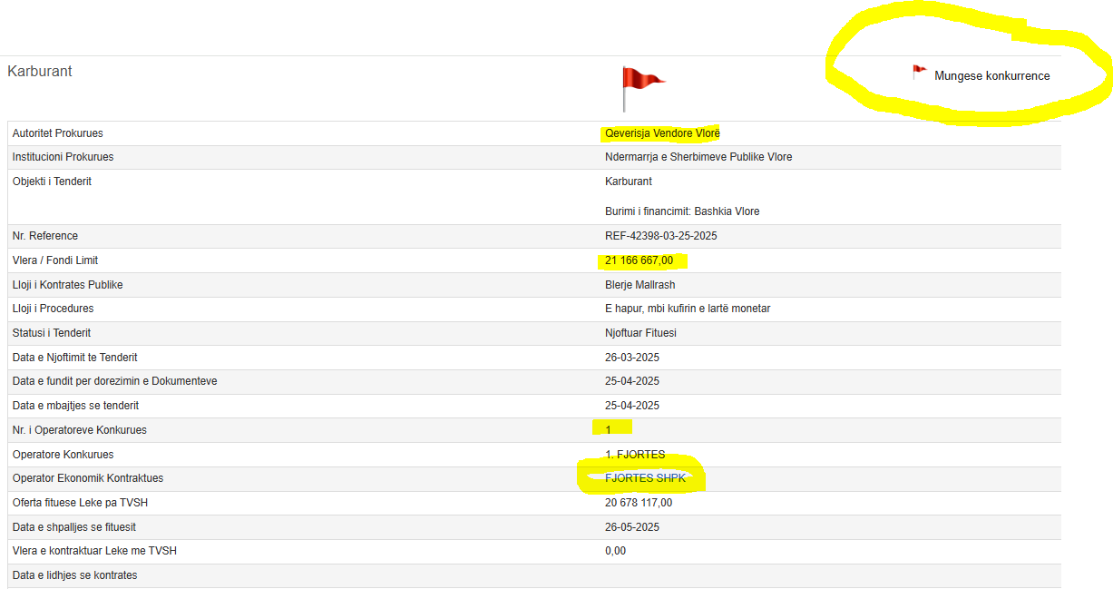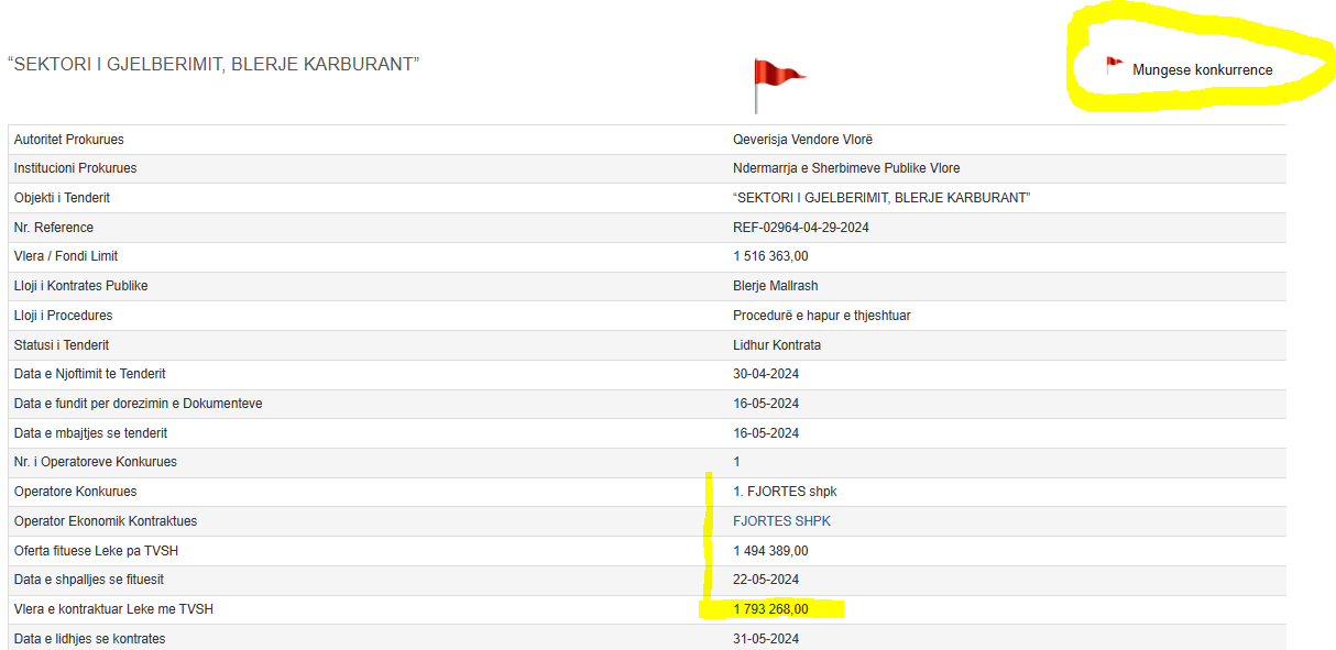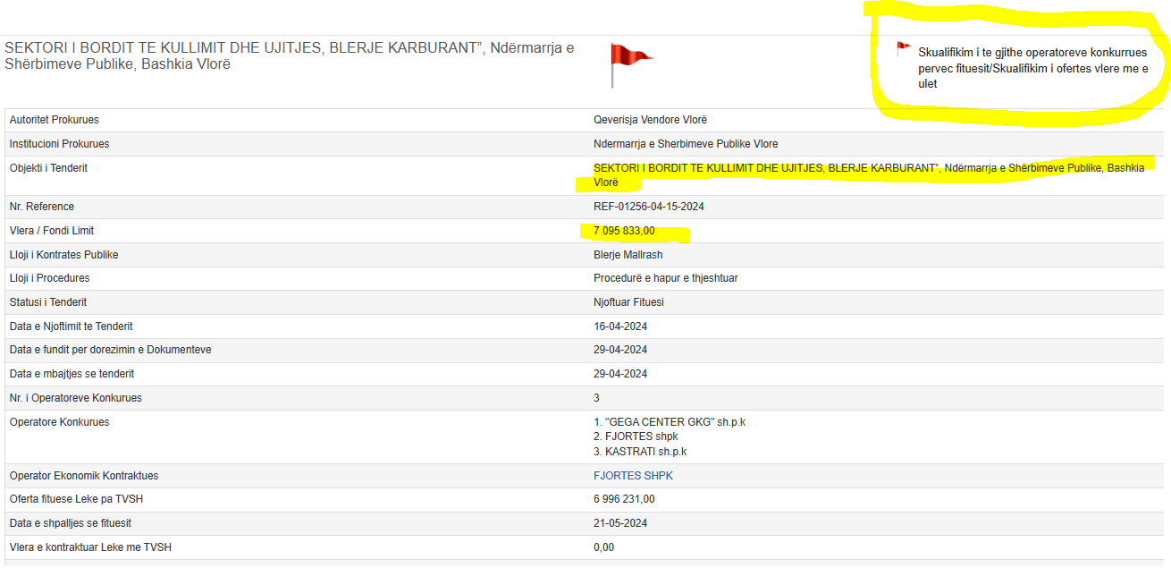 “Skualifikim i të gjithë operatorëve konkurrues përveç fituesit/ Skualifikim i ofertës me vlerë më të ulët”, kështu e klasifikuar tenderin Open Data Albania. Procedura është shënuar me “Flamur të kuq”.