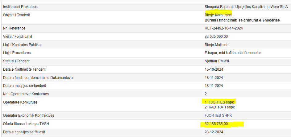 Tenderi është mbyllur shpejt brenda datës 25 prill, sepse vetëm kompania e Dule Sadriajt është paraqitur me ofertë.  “Fjortes” shpk  ka propozuar ofertën 20 678 117,00 lekë pa TVSH, ndërsa në dokumentet e shpalljes së fituesit, më 26 maj 2025, nuk pasqyrohet as fitimi për litër i kompanisë për karburantin e furnizuar, as ndonjë e dhënë tjetër, siç mund të ishte referenca në bursën ndërkombëtare.