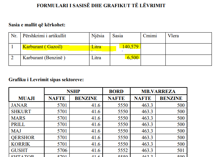 Sipas grafikut të lëvrimit, “Fjortes” shpk do të furnizojë Bashkinë Vlorë me 140,579 litra naftë dhe 6500 litra benzinë.