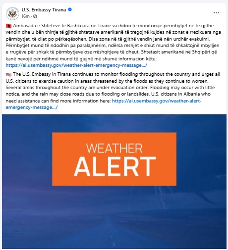 Nëpërmjet një njoftimi në Facebook, Ambasada e Shteteve të Bashkuara në Tiranë ka bërë të ditur se po monitoron nga afër situatën e përmbytjeve në të gjithë Shqipërinë, duke paralajmëruar për përkeqësim të kushteve në disa zona të vendit.