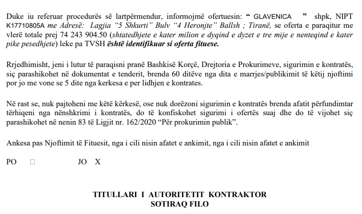 Operator Ekonomik Kontraktues “GLAVENICA” shpk ka pronarë Lavdimir dhe Majlinda Baraj, ndërsa administratore është Jona Baraj. Oferta e paraqitur nga ky operator është 74 243 904,00 lekë, por kontrata me përfshirjen e TVSH pritet të kapërcejë shifrën 1 milion euro. Sipas dokumenteve, formulari i shpalljes së fituesit është publikuar më 19 shtator 2025 dhe mban firmën e Filos.