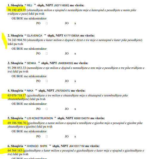 Kompania “ NIKA ” shpk, ofroi ta bënte punën me 63 070 718.17 lekë pa tvsh. Ndërsa firma “ LIS KONSTRUKSION ” shpk, ofroi vlerën: 69 186 506.76 lekë pa tvsh.