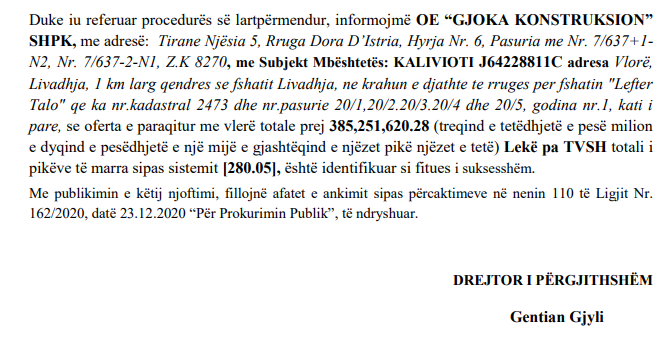 Siç mund ta shihni në dokumentin më sipër, Operatori Ekonomik Kontraktues “GJOKA KONSTRUKSION” shpk ka paraqitur ofertën fituese 385 251 620,00 lekë pa TVSH.