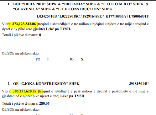 Ndërsa bashkimi i operatorëve “DEHA 2010” SHPK & “BRITANIA” SHPK & “C O L O M B O” SHPK & “GLAVENICA” SHPK & “L.T.E CONSTRUCTION” SHPK ka propozuar ta bëjë këtë punë me 373,123,342.06 Lekë pa TVSH. Janë afro 130 milionë lekë më pak që do t’i kurseheshin buxheti të shtetit nëse kjo ofertë nuk do të hidhej në kosh.