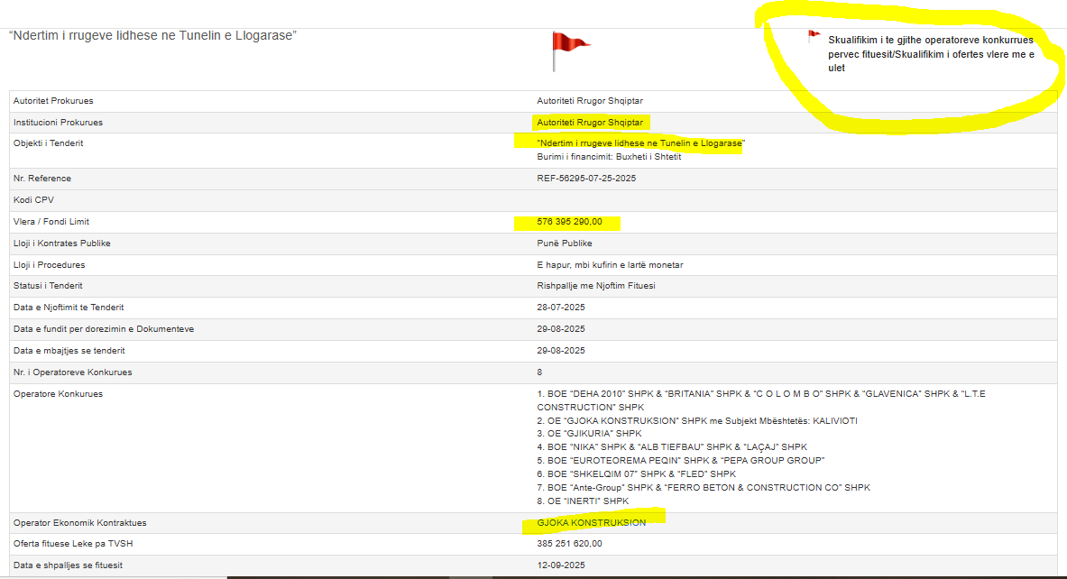 Tenderi për të cilin raportohet, është organizuar nga Autoriteti Rrugor Shqiptar dhe ka si objekti “Ndërtim i rrugëve lidhëse në Tunelin e Llogarasë”. Vlera e Fondit Limit të përllogaritur nga komisioni i tenderit është 576 395 290,00 lekë pa TVSH. Theksojmë se tenderi është rishpallur dhe është mbajtur më 29 gusht, pas një njoftimi të paqartë, por tashmë kemi një fitues.