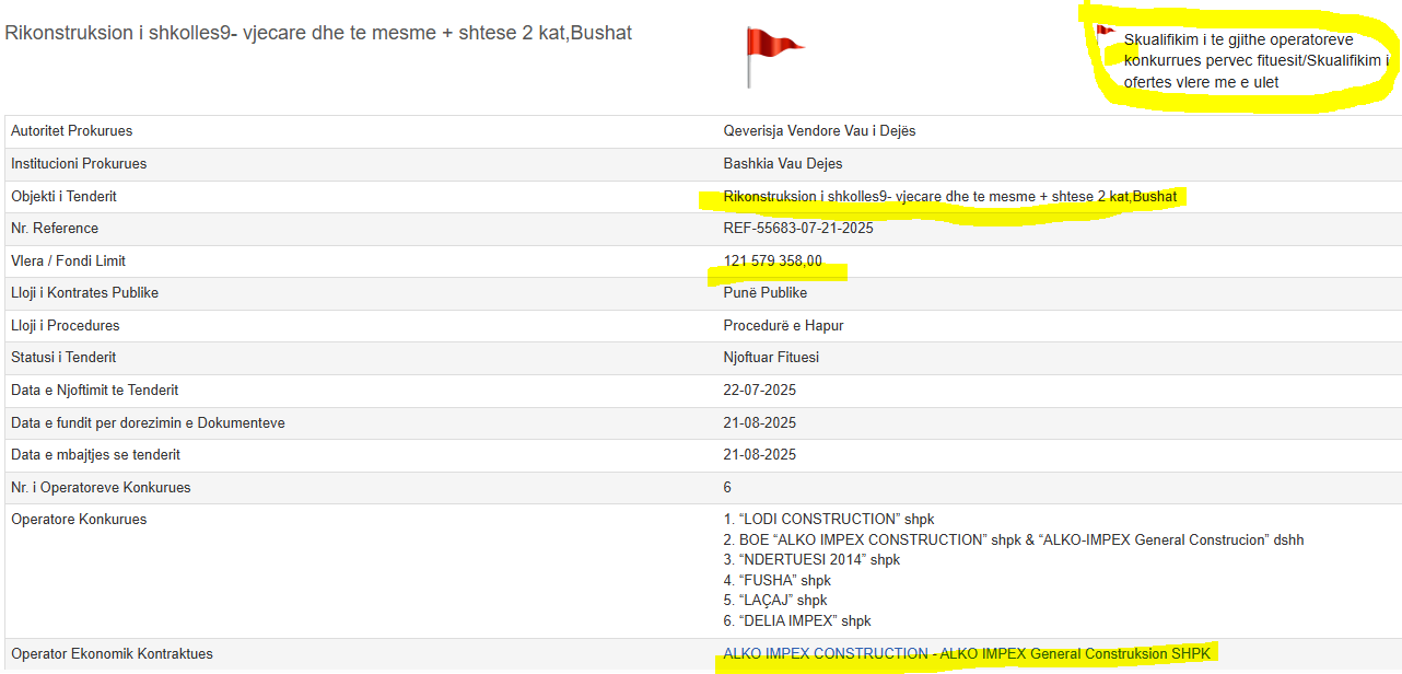 Më konkretisht, raporti ynë ka në qendër tenderin e Bashkisë Vau Dejës me objekt “Rikonstruksion i shkollës 9-vjeçare dhe të mesme + shtesë 2 kate, Bushat”. Fondi limit i përcaktuar për këtë projekt e ka vlerën 121 579 358,00 lekë pa TVSH.