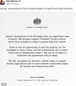 “Pranimi nga Hamas i planit amerikan të paqes është një hap i rëndësishëm përpara. Ne mbështesim fuqimisht përpjekjet e Presidentit Trump, të cilat na kanë afruar më shumë se kurrë më parë drejt paqes. Tani ekziston një mundësi për t’i dhënë fund luftimeve, për kthimin e pengjeve në shtëpi dhe për t’i çuar ndihmat humanitare atyre që kanë aq shumë nevojë për to. Ne u bëjmë thirrje të gjitha palëve që të zbatojnë marrëveshjen pa vonesë. Mbretëria e Bashkuar, së bashku me partnerët tanë, është gati të mbështesë negociata të mëtejshme dhe të punojë drejt një paqeje të qëndrueshme si për izraelitët ashtu edhe për palestinezët.”, shkruan ai.