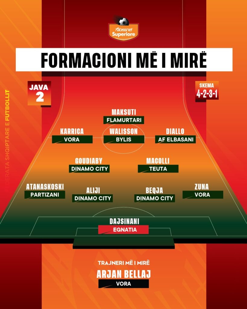 Java e dytë e kampionatit “Abissnet Superiore” u mbyll mbrëmjen e së dielës me sfidën Dinamo City – Vllaznia, që përfundoi me fitoren 3-1 të dinamovitëve. Pas përfundimit të ndeshjeve, trajnerët e ekipeve kombëtare të moshave kanë përzgjedhur edhe formacionin më të spikatur të javës, në skemën 4-2-3-1.