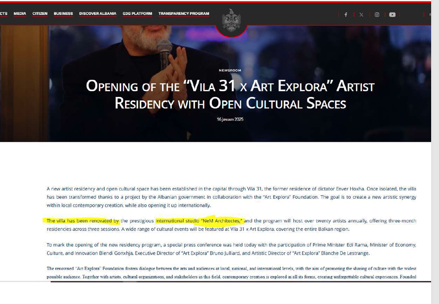 Restaurimi i Vilës 31 është prezantuar si një punë e kryer nga studio arkitekturore NeM Architects. Por dokumentet zyrtare tregojnë një histori tjetër. Rezulton se 1.2 milion euro nga fondet publike janë prokuruar më herët për rikonstruksionin e Vilës 31 nga Drejtoria e Shërbimeve Qeveritare, me miratim të Kryeministrit. Madje, operatori ekonomik ‘Valona Konstruksion shpk’ është shpallur fitues i tenderit, dhe më 21 korrik 2023 ka lidhur kontratën nr. 144/17 me Drejtorinë e Shërbimeve Qeveritare, me afat realizimi 12 muaj, pikërisht për rikonstruksionin e Vilës 31.