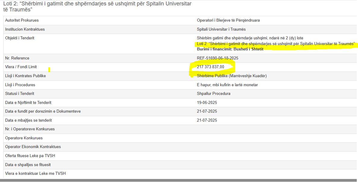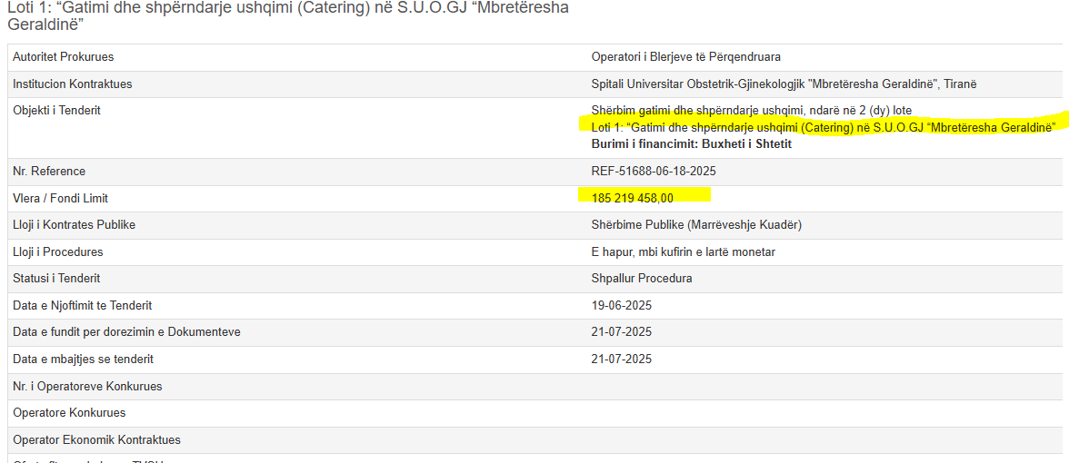 Procedura e Prokurimit e publikuar nga Operatori i Blerjeve të Përqendruara që gatimi dhe shpërndarja e ushqimit (Catering) në S.U.O.GJ “Mbretëresha Geraldinë”, të kushtojë 185.2 milionë lekë pa tvsh, ndërsa për Spitalin Universitar të Traumës, 217.3 milionë lekë pa TVSH.