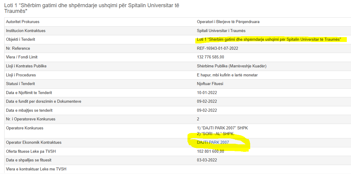 Kujtojmë se “Dajti Park 2007” furnizon ushqimin e spitalit të Traumës që nga viti 2022. Kjo kompani është përfituese e tenderit “Loti 1 “Shërbim gatimi dhe shpërndarje ushqimi për Spitalin Universitar të Traumës” me fondi limit 132 776 585,00 lekë pa TVSH.