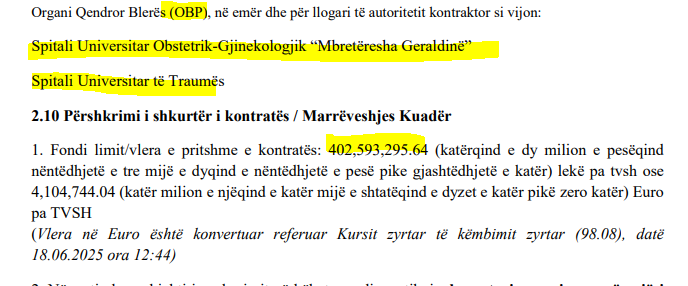 Më konkretisht, objekti i kontratës është “Shërbim Gatimi dhe shpërndarje ushqimi, ndarë në 2 pjesë: Loti 1: “Gatimi dhe shpërndarje ushqimi (Catering) në S.U.O.GJ “Mbretëresha Geraldinë”; Loti 2: “Shërbimi i gatimit dhe shpërndarjes së ushqimit për Spitalin Universitar të Traumës”. Në lojë janë 402,593,295.64 lekë pa tvsh ose 4,104,744.04 Euro pa TVSH.