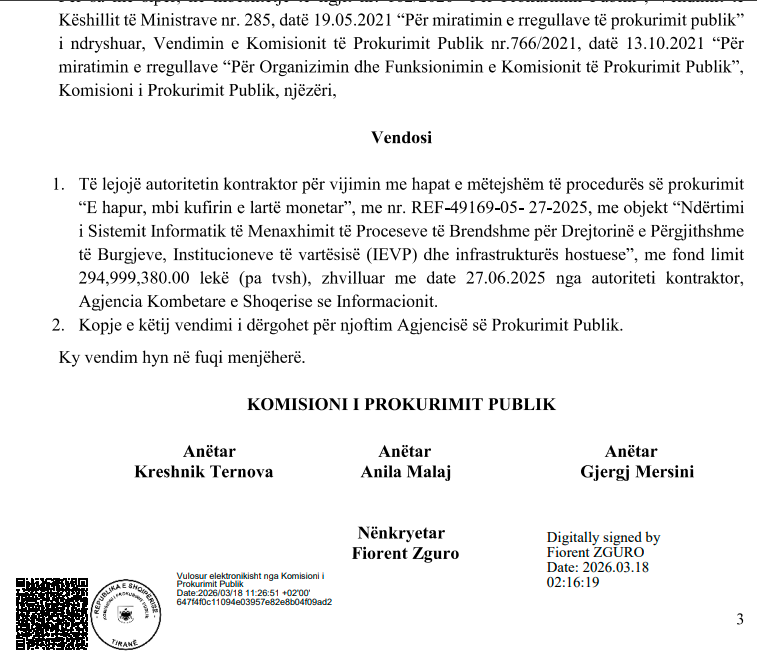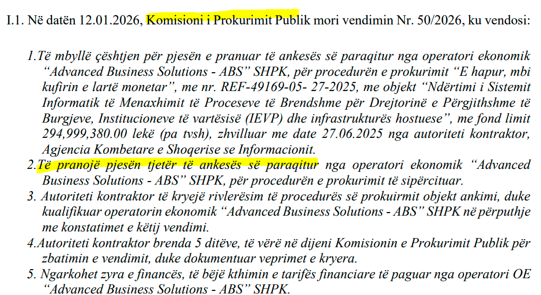 KPP vendosi që AKSHI të vazhdojë me hapat e tjerë të procedurës, pasi u verifikua se oferta e kompanisë ABS të Gerond Meçes ishte rivlerësuar.